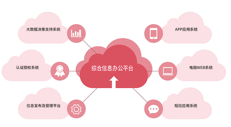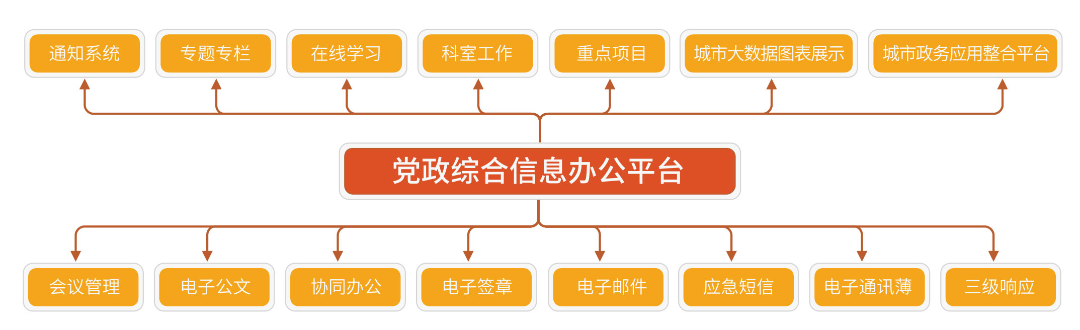 平台实现了通知公告、在线学习、专栏专题、科室工作、城市大数据图表展示、电子公文、协同办公、电子邮件、应急短信电子通讯簿、会议管理、内部微信、电子签章、三级响应等多项功能; 包含了电脑Web端、 手机APP客户端和短信服务程序,通过三种通信方式结合,为应用单位提供综合信息化服务,从而加速信息传达与交互的速度,提高工作效率。