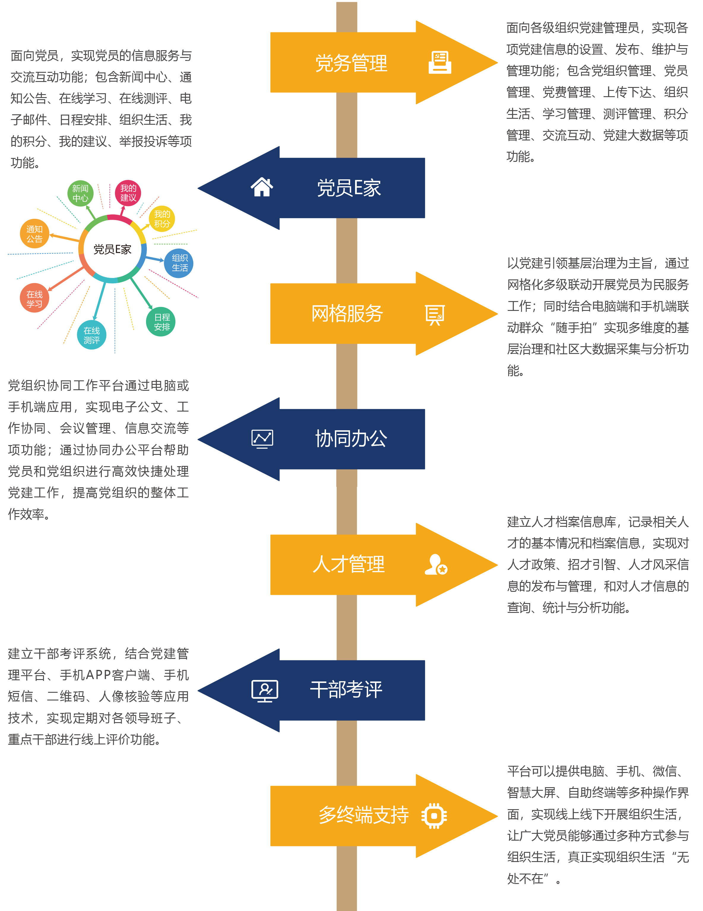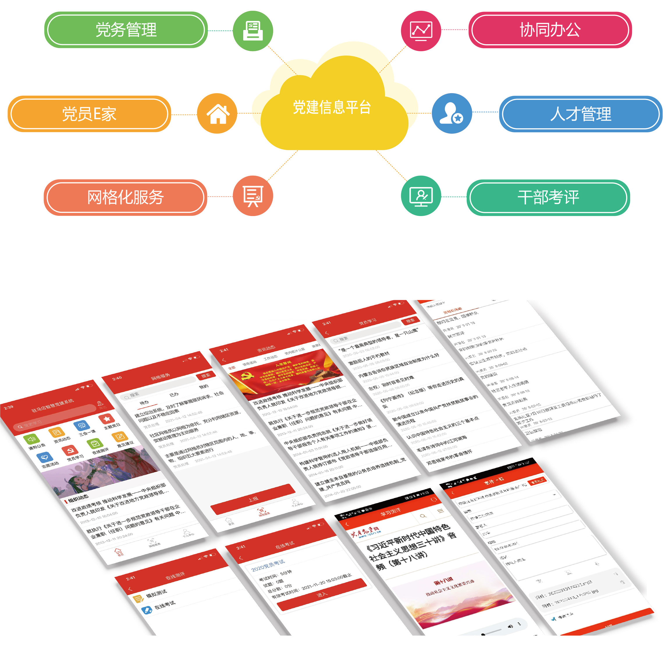 智慧党建平台以一体化操作为核心,运用5G+、GIS地图、大数据与云计算技术,实现党建管理信息化、党建学习网络化、党建考核智能化、党建工作自动化等应用目的。系统以电脑、手机为载体,通过Web端、手机APP、微信、短信等应用至党建管理人员、党员及广大群众;系统有党务管理、党员E家、网格化服务、协同办公、干部考评等子系统组成,功能包含党组织管理、党员信息管理、党建宣传、党建学习、党建活动、党建考核、三会一课、会议管理、公文管理、互动交流等数十项应用功能,最终建成集“宣传、管理、教育、服务、沟通、考核”于一体的智慧党建云平台。