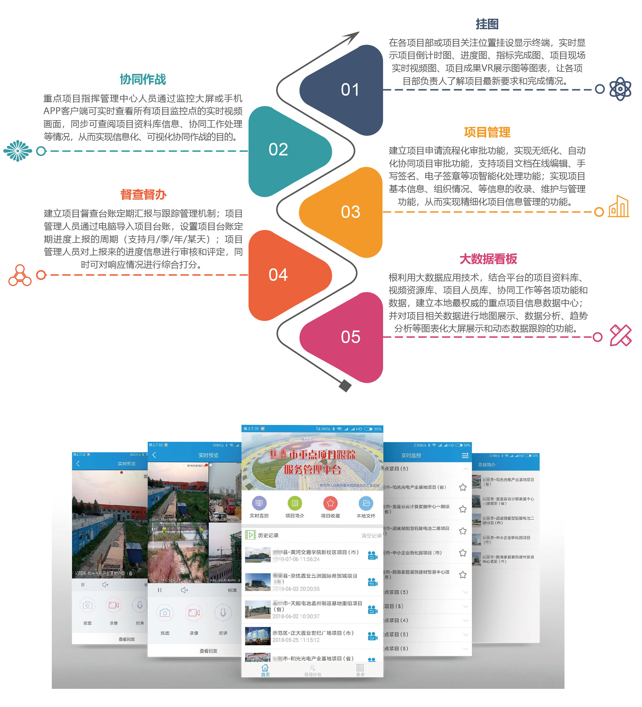 重点项目挂图协同作战管理系统是根据市/县级重点项目建设管理要求研发的一套综合性信息管理系统,是结合信息化、图表化、可视化等先进技术的新一代项目管理系统;她通过挂图和大数据看板树立决策目标,以可视化作战指挥为抓手,利用督查督办管理为项目推动器,通过协同办公平台和智能手机APP客户端进行重点项目的信息化管理、可视化梳理和协同化处理;从而规范重点项目管理流程,提高重点项目推进效率,加强重点项目日常监管,对深化投资体制改革、提高政府执行力,加速智慧城市建设等方面都具有十分重要的意义。