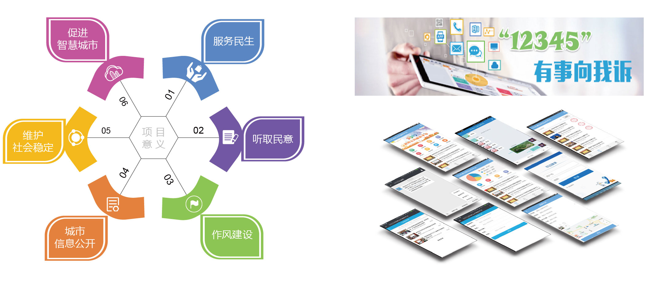 12345,有事找政府”已经深入广大民众的心中,它展现了人民政府执政为民、办事高效的良好形象。随着近几年信息化、互联网、智慧化的快速发展,政府公共服务的方式也在逐渐进行转变,门户网站、微信公众号、手机APP客户端借着受众基数大、传播速度快、内容丰富直观、随时随地随身接收及传播等功能优势在全国各地迅速发展起来;因此新的12345政府公共服务平台也不局限于一部热线电话,而是支持语音、短信、微信、智能手机APP客户端、门户网站的多样化的综合服务平台。